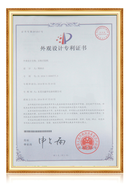 五軸點(diǎn)膠機(jī)專利證書