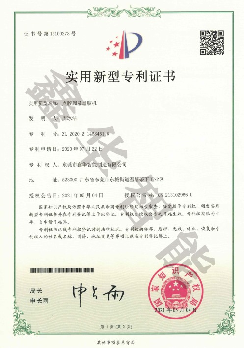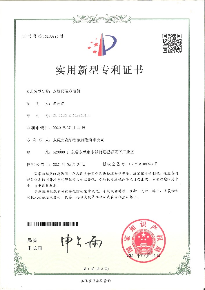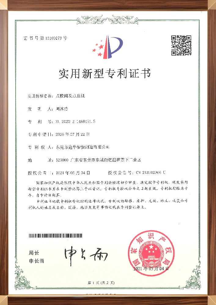 點(diǎn)膠閥及點(diǎn)膠機(jī)專利證書