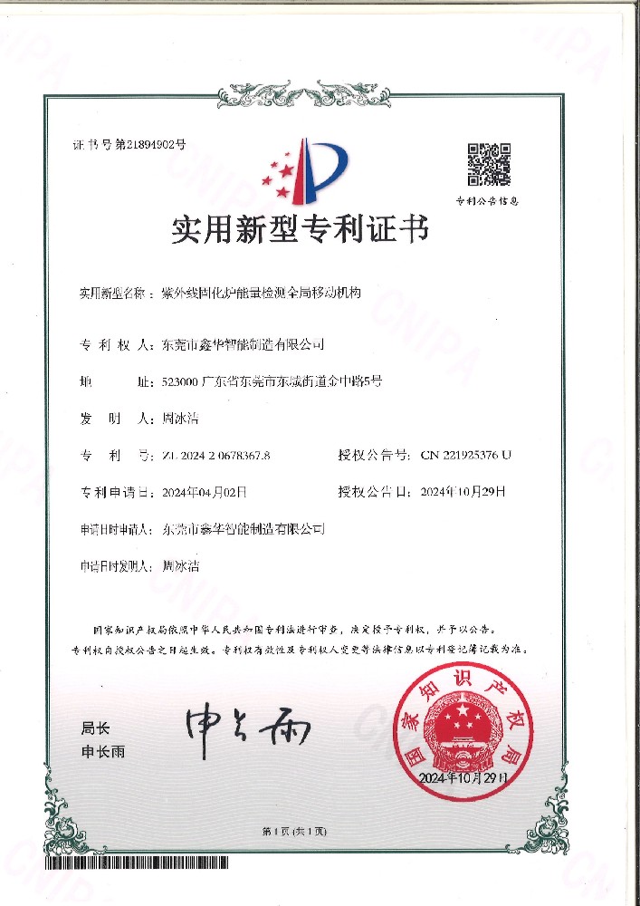 紫外光固化爐能量檢測(cè)全局移動(dòng)機(jī)構(gòu)證書