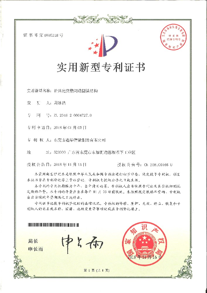 治具定位槽圓弧結(jié)構(gòu)證書